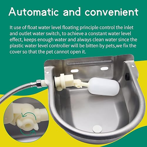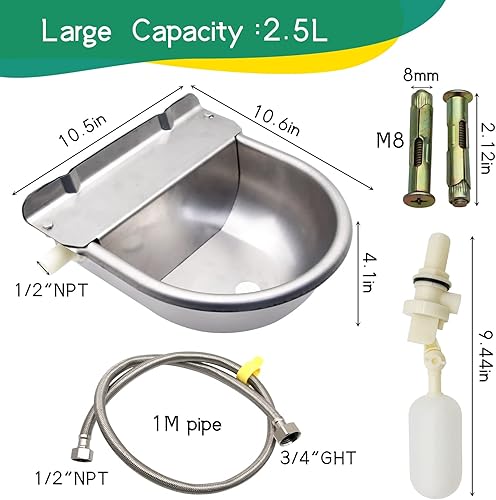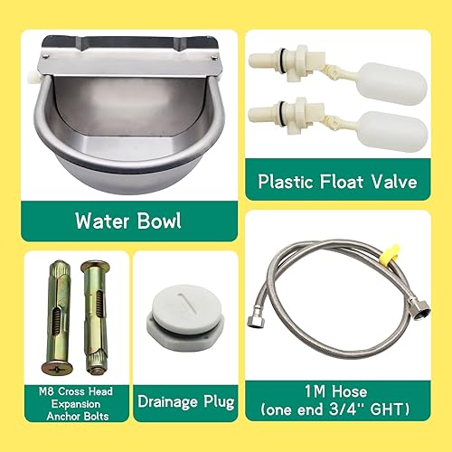 -Product includes :1* stainless steel water bowl (with drain hole), 1 * 1m 3/4'' GHT water hose,2 *plastic water floats,2 *drain plugs,2 * M8 Cross Head Expansion Anchor Bolts (Complete accessories, no need to purchase other accessories)