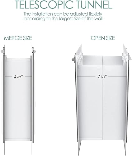 DIMENSION AND TELESCOPING WIDTH: The telescoping tunnel accommodates walls that are 4 3/4 - 7 1/4 in thick.Flap Opening: 8 1/4"W x 12 1/4"H. Frame: 12 1/4"W x 17 1/8"H. Cutout in wall:9 7/8"W x 13 3/4"H.
