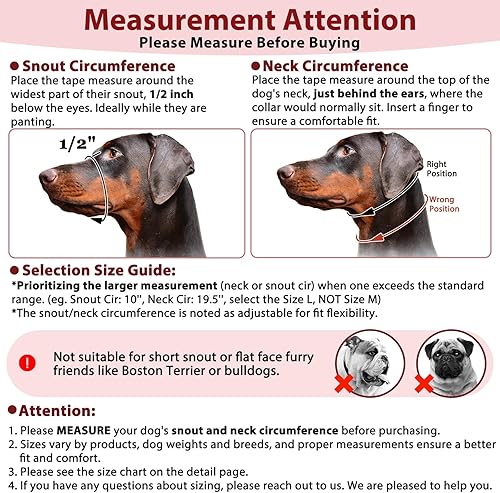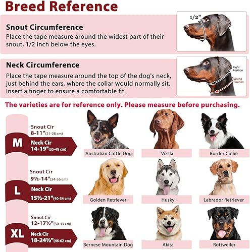 Choose the Right Size: Size L head collar suits for snout circumference 9½”-14” and neck circumference 15½”-21”. No-pull muzzle leash are not suitable for short-nosed breeds such as boxers, pit bulls and bullies. Please measure your dog carefully and check the size chart before ordering. You can find no pull dog nose harness for medium dogs size chart and fitting step-by-step guide in the pictures and description