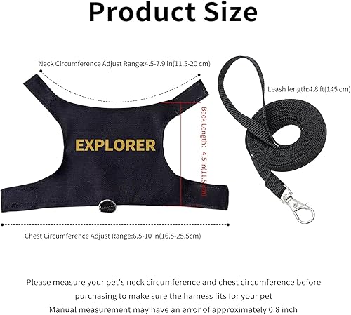 【Size of Bearded Dragon Harness and Leash】 This harness is suitable for small animals with neck circumference: 4.5"- 7.5",chest circumference: 6.5" to 10".This harness set also comes with a 5.2ft leash for escape proof in outdoor walking