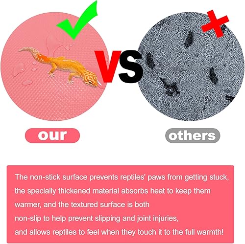 NON-STICK SURFACE: Non-stick smooth surface prevents your reptile's paws from snagging, non-abrasive material is gentle on paws, claws and belly, special thickened material absorbs heat to maintain temperature, textured surface helps prevent your reptile from slipping and causing joint injuries!