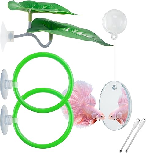 Complete Betta Enrichment Kit for Happy Fish Everything in one set: Training mirror (combat boredom), feeding/training rings (food control & exercise), spoons (hygienic feeding), rest leaf (stress-free sleep). Ultimate Aquarium upgrade!