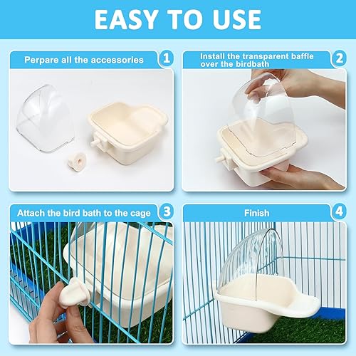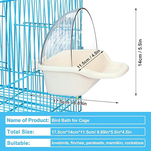 【High Quality Material】The bird bath for cage is made of quality plastic, which is safe and sturdy. You can easily remove it and wash it with water. Size is 6.89 *4.53 *5.51 in. It's subitable for your parakeet bath. Make your bird enjoy the bath even more.