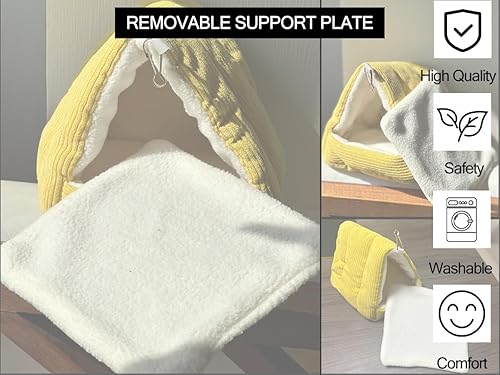Cloud-Soft Bird Bed for Cage: 7.5"Lx7.9"Hx7.5"W bird bed with thick flannel lining.Ultra-plush design comforts parakeets/conures better than basic bird nests.Vibrant yellow attracts birds naturally.Machine-washable & with most cages.