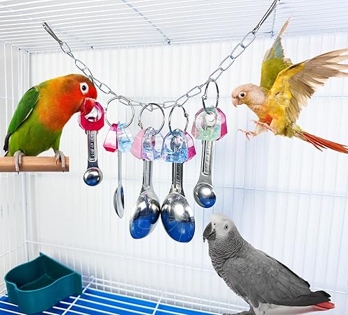 MODERN DESIGN -- Captivating and durable medium-sized bird toy, adorned with colorful acrylic rings and stainless steel measuring spoons for an irresistible visual appeal