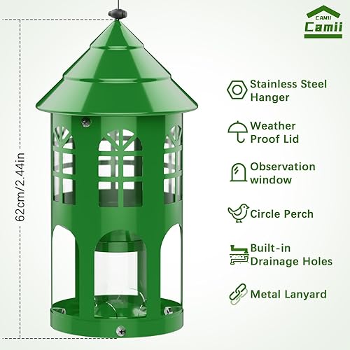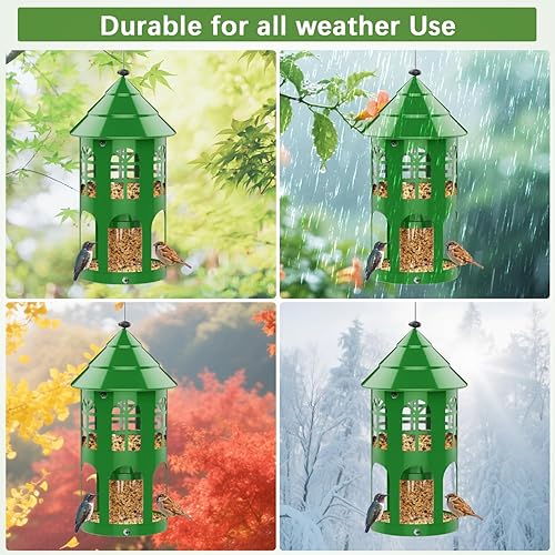 [Metal bird feeder]: Sturdy metal material prevents squirrels from chewing on the bird feeder, and the environmentally friendly outer coating can withstand long-term use in harsh environments, preventing rust and corrosion. The bird feeder for outdoors maintains a brand-new appearance and perfect functionality in sunny, rainy and snowy weather.