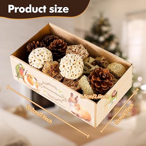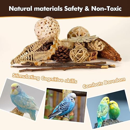 【Safe and Diverse Materials】This bird toys is natural bird foraging box,made from eco-friendly, pet-safe pine cones, apple wood,apple wood chew block,coconut shells,sola fibers,loofahs,spiral seegrass,wicker balls and corn,no metals, paints,plastic or dyed items, ensuring hours of worry-free fun for your bird friends.