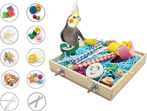 Interactive Bird Foraging Fun: Enhance your feathered friend's playtime with the bird foraging toys box, a wooden chew box filled with variety natural materials. Encourage your small birds, such as parakeets, cockatiels, lovebirds, and conures, to engage in playful chewing, nibbling, and exploration.