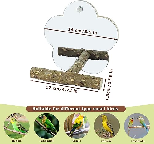 【Material】This Mirror made of acrylic with beech wood stand, safe, durable and will nerver hurt the parrot. Notice: Please tear off the protective films on the mirror surface before installation.