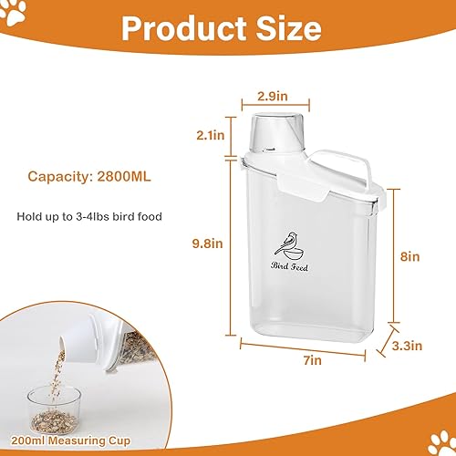 【Airtight pet food container】- Each matching lid and measuring cup features a silicone seal to ensure a airtight, The good sealing design is leak-proof, moisture-proof and dust-proof, which can keep the bird seeds dry and prevent the action of mouse and squirrels.