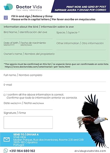 EASY SAMPLE COLLECTION - The test kit includes everything needed to safely collect and send a feather or blood sample from your bird for analysis, with instructions to minimize stress. If you are in a hurry and don't want to wait for the kit to arrive at your home by post, you can PRINT THE KIT AT HOME NOW. Just print the image 3, 4 and 5 and send with the samples to our address in a envelope with a basic national postage.