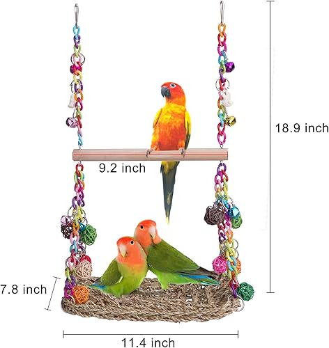 Natural Material: The bird swing toy is hand-woven from natural chewable seagrass, the top bird perch is made of willow wood bar, hang by colored plastic chains, and decorated with rattan balls and bells, safe for your bird to chew or peck at. Pefect for parrots to play and rest.