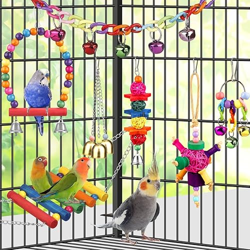 NICE VARITEY :A nice variety of colorful bird toys,including bridge hammock,swing with bells,3 bell toy,perch,toy bells with rings,little rattan ball toy,twig ball toy,rainbow chain and wooden bird chewing toy,9 pcs different bird toys will make your birdcage looks like a bird mansion.