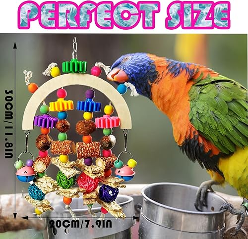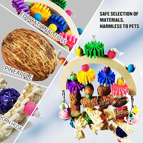 Made of corncob, natural rattan ball, wooden mango fruit, handmade, bright colors, harmless to pets, the bells hanging on both sides (can be removed and used separately) can increase the interest of the birds. Easily attract parrot birds to chew and play, they will spend a long time playing with these toys every day, keep your parrot busy, less destructive and more fun.