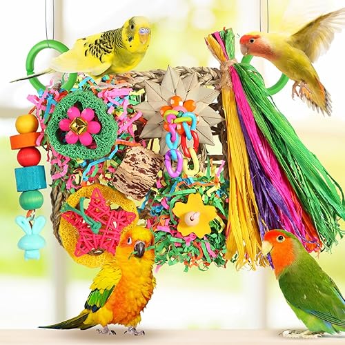 Natural Delight: Crafted from eco-friendly seagrass and adorned with an array of colorful chew toys made from natural wood, paper, corn husk, walnut, Loofah,palm leaf and acrylic chain, the YIXUND Adventure Foraging Playground offers a safe and enjoyable play experience for your feathered companions.