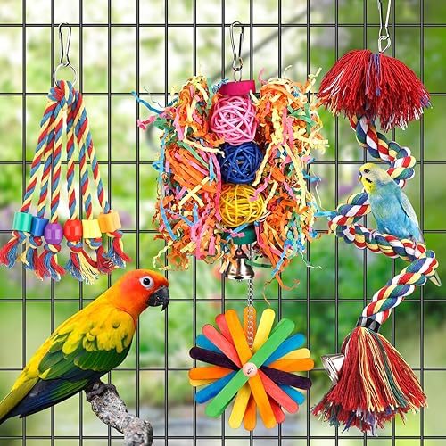 FORAGING AND SHREDDING STIMULATION: Coming a hanging hand-woven basket and rattan balls of confetti,brightly colored popsicle sticks,interesting plastics beads,the bird toys are designed to promote natural foraging and shredding instincts in birds, helps keep their beaks healthy and provides mental stimulation and prevent boredom.
