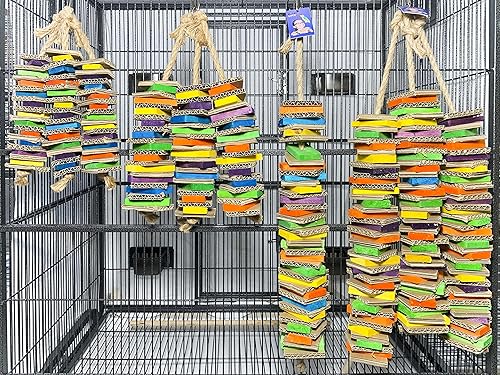BIG ENOUGH FOR MACAWS, EASY ENOUGH TO DESTROY FOR MEDIUM BIRDS: perfect size and type of materials for lots a playtime - The wood blocks are 2.5 x 1.25" and 0.5" thick and the cardboard squares, hung on natural sisal, are 2.7 x 2" and .3" thick