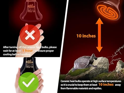 【Safety Instructions】The surface temperature of ceramic bulbs is generally high, so it is important to keep them at a safe distance from flammable materials and pets to prevent accidents. During use, it is recommended to maintain a distance of at least 30 cm (10 inches) between the heat bulb and the reptile. After turning off the ceramic heat bulb, wait at least 1 hour to ensure proper cooling before handling.