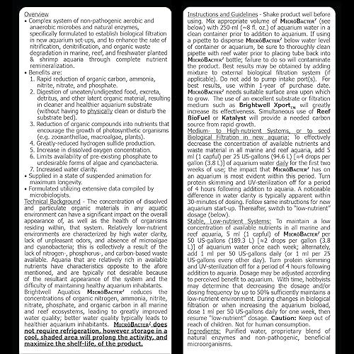 NUTRIENT REMINERALIZATION – The MicroBacter7 formula introduces aquarium bacteria to enhance nitrification, denitrification, and organic waste degradation in both marine and freshwater aquaria and limits the availability of pre-existing phosphate.