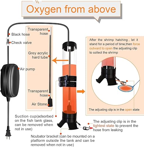 1. Fully equipped:Brine shrimp incubator provide a set of tools (20 pcs in total) for oxygen supply, hatching, and collection, feeding and storage of live brine shrimp fry after hatching, including: a brine shrimp eggs incubator , a air Pump, a acrylic rigid tube, 30 centimetre transparent Silicone hose,100 centimetre black Silicone hose, a air stone, a check valve, a regulating valve, a brine shrimp collection net, three brine shrimp straws , two automatic brine shrimp feeders, five storagers and a adjusting clip for brine shrimp