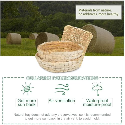 【Package Included】This set contains 2 bunny grass beds 8 "in diameter and 1 woven grass mat 11" in length and 8 "in width. Made from pure natural grass, it provides a comfortable resting place for your pet. More suitable for small animals such as guinea pigs, dwarf rabbits, chinchillas, hamsters, squirrels, honey gliders, hedgehogs, parrots, pigeons, etc.