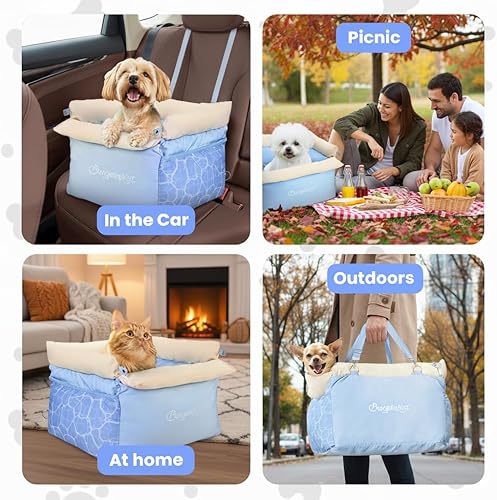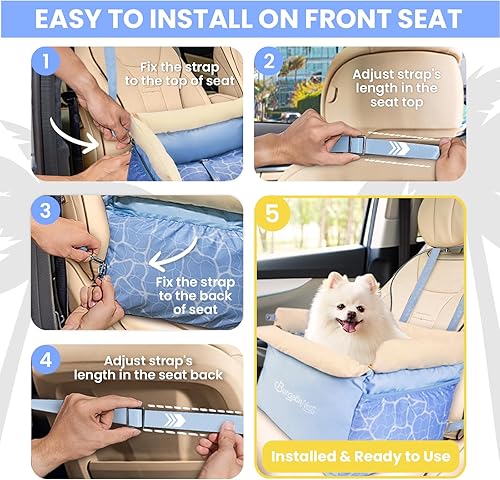 2 Storage Pockets and 2 Sided Cushions : There are large capacity storage bags on both sides of small dog car seat. It's very convenient for you to put pet daily necessities to save space. The seat cushion features a reversible design—one side with a stylish wave pattern, the other in a soft light blue. Very suitable for dog carriers & travel products and summer use.