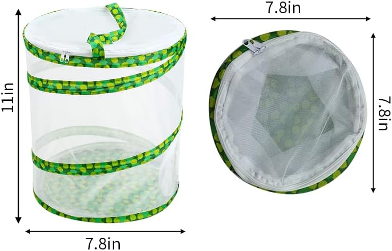 Easy to Use:The pop-up insect and butterfly habitat cage has a double zipper at the top to fully unzip it. This makes it much easier to add things to the butterfly habitat cage. The side zipper window design makes it more convenient to feed the butterflies. The polyester bottom of the butterfly habitat cage is easier to clean. Butterflies Tent Size:The unfolded measures: 7.8"Dia. X11" Tall, with enough space for new butterflies to fly without breaking their wings. The pop-up insect and butterfly habitat cage can be folded, making it easy to store and reuse.