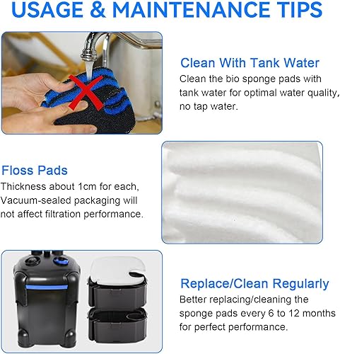 Tips for Maintenance:✔Resine the bio sponge pads with tank water for optimal water quality, do not use tap water.✔Replace or rinse sponge pads every 6 to 12 months for optimal performance✔Better replace the white polishing pad every 2 to 6 weeks.
