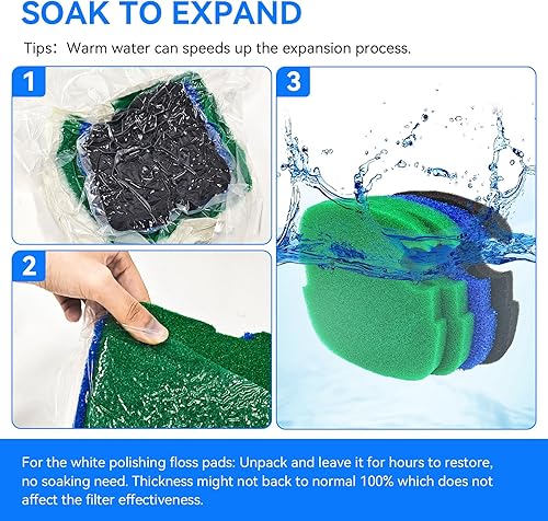 Tips for Maintenance:✔Replace or rinse sponge pads every 6 to 12 months for optimal performance✔Better replace the white polishing pad every 2 to 6 weeks.✔Resine the bio sponge pads with tank water for optimal water quality, do not use tap water.