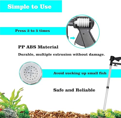 ❤New safety design: new manual press design, no electricity required.High-quality pressure resistant air bag, durable, super strong siphon pressure can quickly draw out the muddy water in the fish tank.