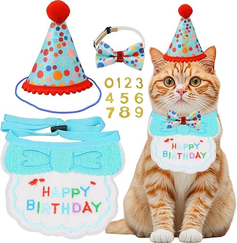 Cat Birthday Party Supplies: Cat Birthday Hat*1, Cat Birthday Bandana*1, Bowtie*1, Birthday Numbers(0-9). Get ready to dress up your furry friends for their birthday party!