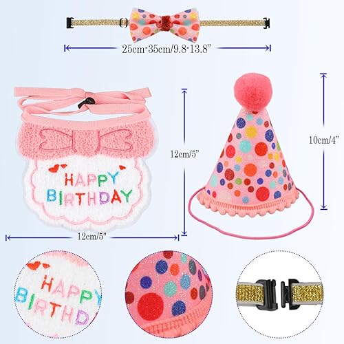 Adjustable Size: Cat birthday bandana, hat and bowtie are designed with adjustable buckle, you can adjust the width according to the size of your pet's neck.Please check the size chart as well as measure your pet's neck circumference before ordering,besides, remember to reserve a certain length. (Note that there is a 2-3cm error due to manual measurement.)