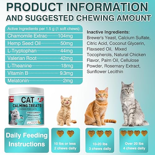 Veterinary Recommended, Safe and Reliable: This calming cat chews is made from safe ingredients such as hemp seed oil and chamomile. Each cat calming chews is precisely measured to ensure your cat’s health and safety. Follow the weight-based feeding guidelines for cat calming treats for indoor cats to keep your cat relaxed and comfortable. These calming care for cats are a trusted solution for anxiety and better sleep