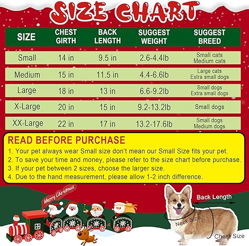 Multi Sizes: The small size fit chest size 14", back length 9.5", suggest weight 2.6-4.4lb, suggestted for small cats and medium cats. This Christmas dog outfit has 5 sizes for choose. To save your time and money, please refer to the size chart before purchase.