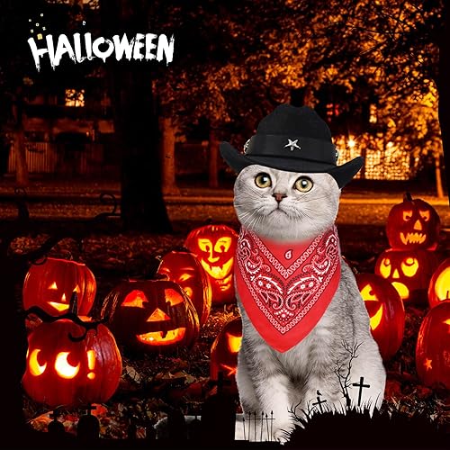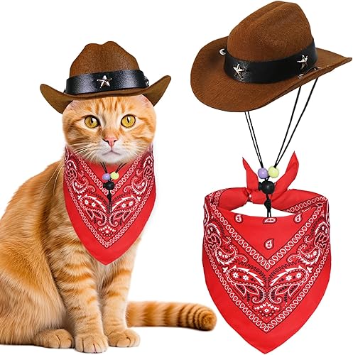 Cat Cowboy Costume: You will received 1 brown cat cowboy hat and 1 red cat bandana. This set of pet cowboy costume will make your cat look like a cute and stylish cowboy, add more fun for Halloween Party.