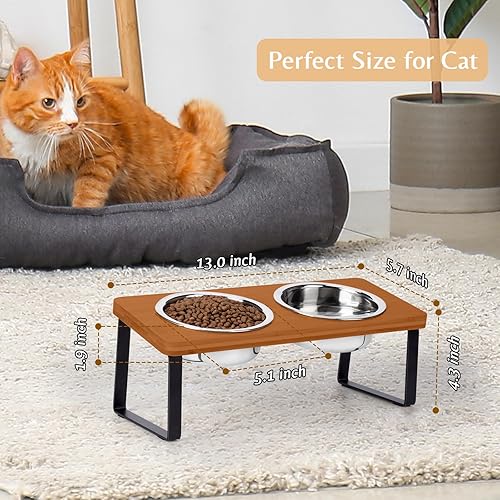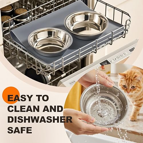 DURABLE AND LONG-LASTING - Cat food bowl is made of strong raises metal rack, help cats swallow more easily and. Slight tilt stand with waterproof finish, don't easily break out over time. Come with no-slip pads, so cat bowls don’t slide around while kitten eating.