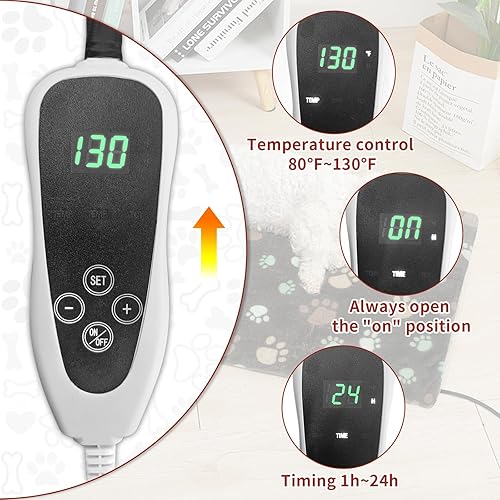 【Smart Thermostat】This pet heating pad can adjust the temperature freely, providing a temperature control range of 80-130°F, supporting 1-24 hours of free adjustment, adding a "normally open ON" mode, the pet heating pad also has a power-off protection function, built-in intelligent overheating protection sensor, intimate design for pets, avoid overheating and provide just the right amount of warmth for your pet.