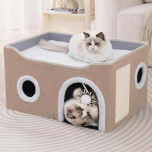 【Spacious & Private Space】 2-in-1 cat house consists of two parts, with an open large cat bed on the upper level and a semi enclosed cat hideaway condo on the lower level. Cat beds for indoor cats with a cat cave on the lower floor is designed according to the habits of cats, as a closed environment makes it easier for cats to feel safe. Our cat hut can provide a spacious and private space for your cat, making it feel warm and comfortable. Allowing your cats to rest and play in cat cube happily.