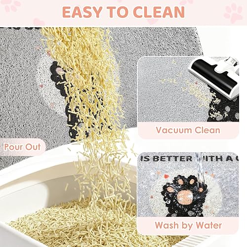 【GENTLE ON PAWS & EASY TO CLEAN】Made from 100% soft polyester provides a gentle surface for sensitive paws. Shake off loose litter back into the box, Excess litter use a vacuum, For deep cleaning just rinse the mat or wash by water with soapy water and let it air-dry.