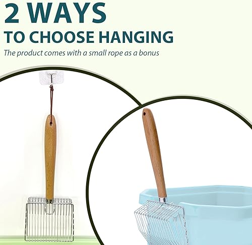 【NOT Bendable & More Convenient with Hook】: The metal litter scoop with sturdy nature can be used repeatedly for heavy duty litter filtration to clean litter waste more efficiently, it won't bend and break easily like plastic scoop handles. With hook design, you can hang the cat litter scoop inside or outside the litter box