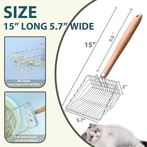 【High Quality Materials】: Our cat litter scoop is made of high quality corrosion-resistant stainless steel material, the wooden handle is more comfortable to hold than plastic handle and lasts longer, reducing the cost of frequent replacement