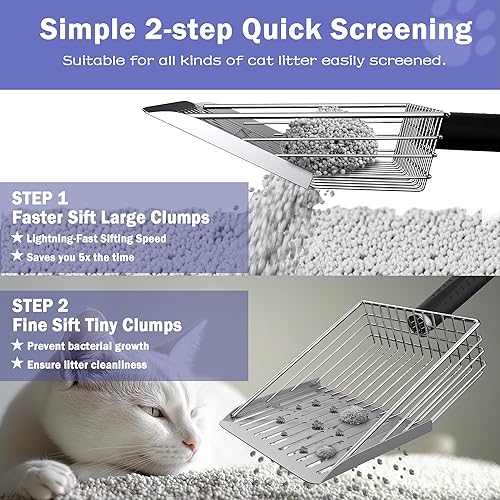 DOUBLE SIZE: This cat litter scooper has well-designed coarse and fine sieves. It can quickly separate small and large rubbish clumps and is suitable for different types of litter, say goodbye to tedious shaking sieves, saving time and labor. So busy pet parents can save more time with their furry friends