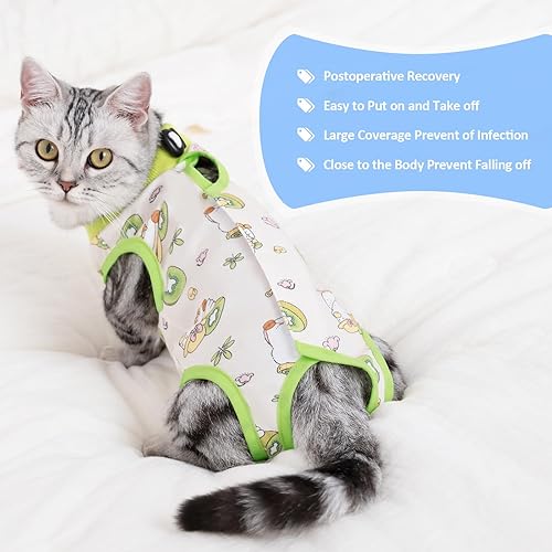 【About Size】 Size S: Chest Girth: 10-10.8 in, Back Length: 7.2 in. Size M: Chest Girth: 11-13.8 in, Back Length: 10.2 in. Size L: Chest Girth: 14-16.8 in, Back Length: 13.2 in. We offer various patterns and bright colors, with pink alpaca, blue cat, and green elephant and so on. If you need to change it for washing, you may order 2 items. Package includes 1x cat recovery suit.