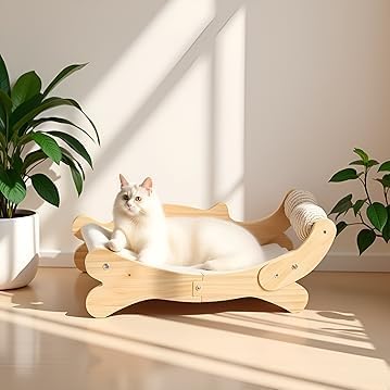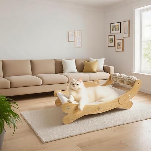 【3-in-1 Multifunctional Cat Scratcher Bed for Indoor Cats 】 Transform your cat’s playtime with our wooden cat scratcher bed, combining a scratching post, hammock lounge, and perch in one space-saving design. Perfect for indoor cats to scratch, nap, and climb—saving your furniture from claw damage while keeping them entertained for hours.