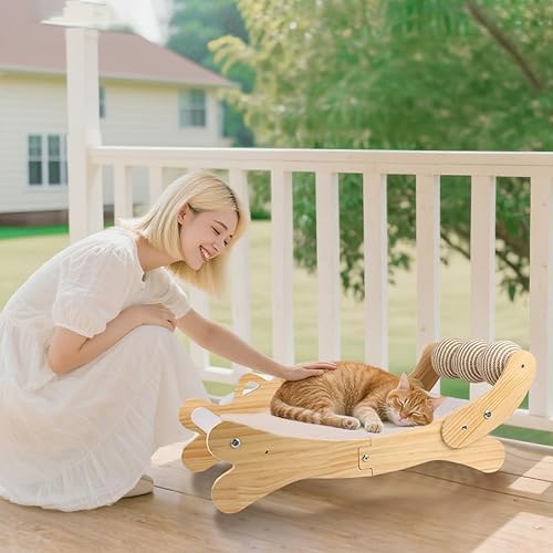 【Ultra-Durable & Cat-Approved Wood Materials 】 Crafted from premium rubberwood and 100% eco-friendly natural sisal, this cat lounger scratcher resists shredding and lasts longer than flimsy cardboard alternatives. The curved scratching surface supports healthy claw maintenance, while the breathable cat lounger hammock offers a cozy spot for lounging.