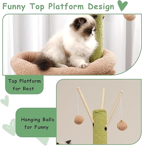 Funny top platform:This cat tree tower is not only designed with a top platform for cats to lie down, rest and observe, but it also has multiple fur balls hanging from the highest point for cats to play and romp around.