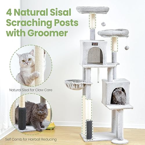 Cozy Resting and Hiding Spots: The indoor cat trees have plush perches, enclosed caves, and soft hammocks. The oversized multicat cat tree tower climbers with sisal post with double platform offers comfortable and secure areas for cats to relax, nap, or observe their surroundings, catering to both playful and timid personalities.