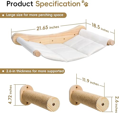 STURDY AND SAFE : The wall mounted cat furniture is made of rubberwood, which is very sturdy and durable. Includes the cat wall hammock and 2 sisal cat scratching posts for support, the thickness of the rubberwood design for the cat's safety. Let your cat enjoy playtime and fulfill your indoor cat's nature to climb and be in high places.