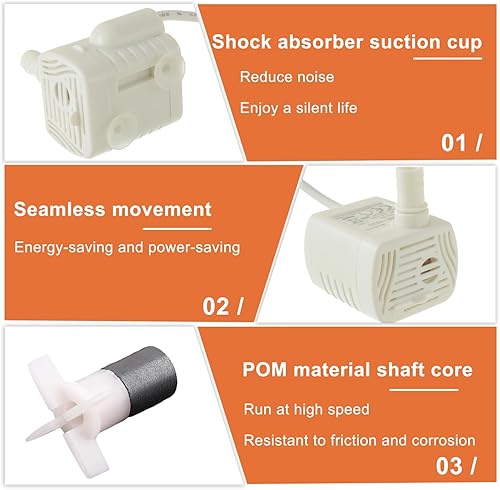 6ft power cable, long enough for daily using;Comes with 2 suction cups on bottom of pump;Ultra quiet(below 40dB), DC 3.5-9V low power consumption