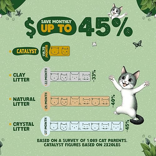LASTS AT LEAST 4 MONTHS: Each 20lb bag of Catalyst lasts for a full month per cat, making Catalyst the best choice for cat owners looking to save money without sacrificing performance. And for even more value, our 20lb multi-pack will last up to four months for one cat. At just six cents per use, Catalyst is the same cost or less per use than the average clumping clay litter, making it the clear choice for eco-conscious and budget-savvy cat lovers alike.
